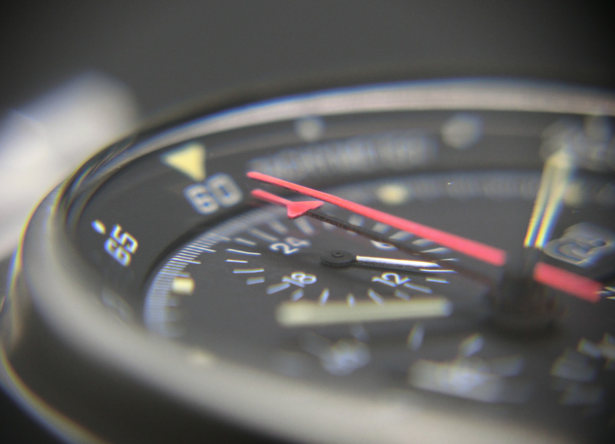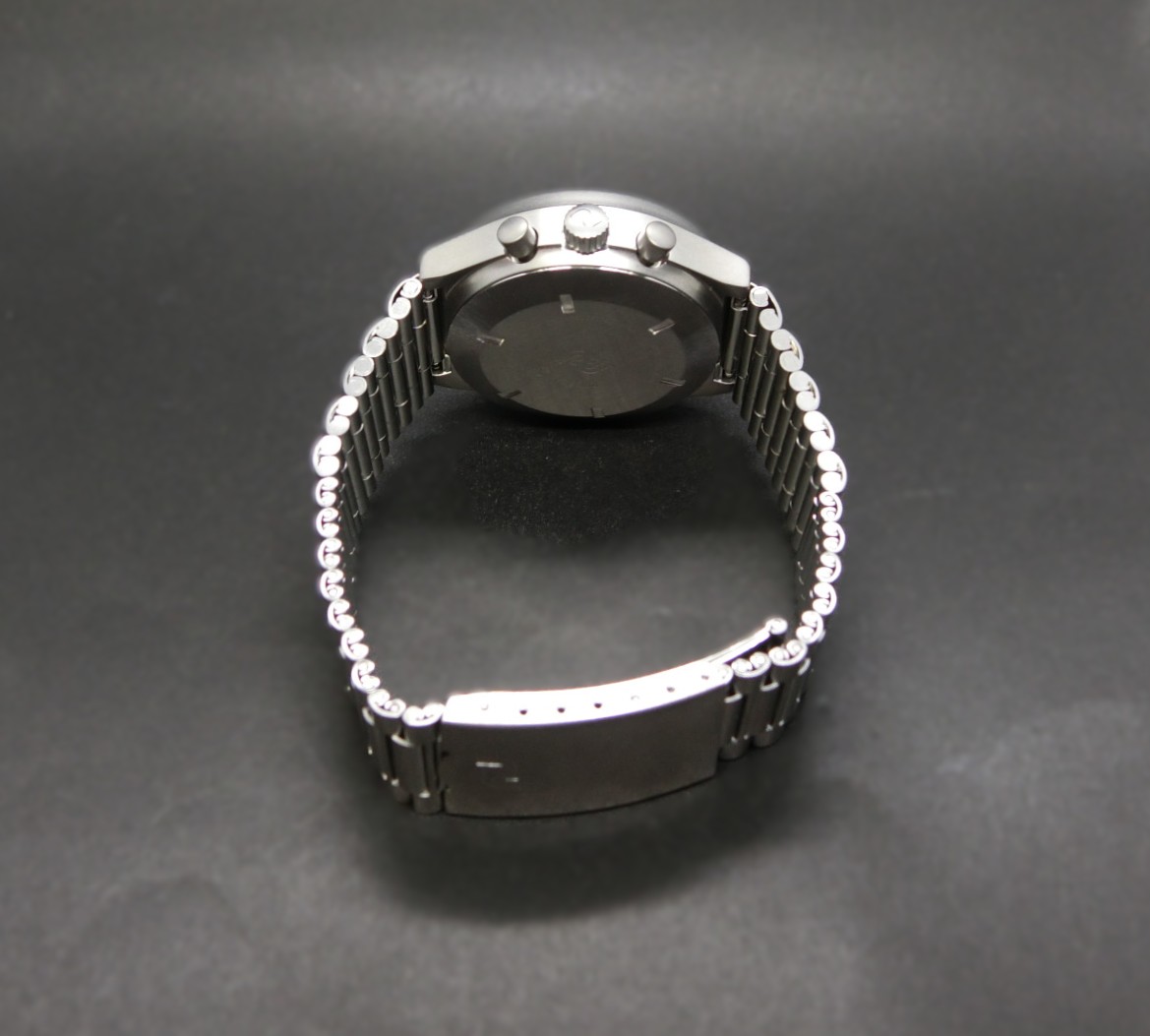 丸型の夜光インデックスを備え、タキメーターの「60」位置には初期型特有の小さな三角マーカーが配置されています。クロノグラフのセンターミニッツハンドは、後期のロリポップではなく飛行機を思わせる初期デザインの先端形状を採用。ムーブメントは軍用時計にも使われていたレマニア5100 を搭載。