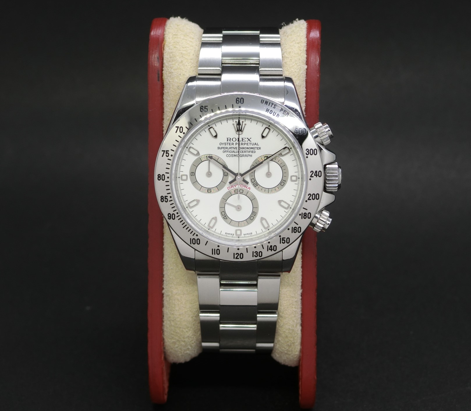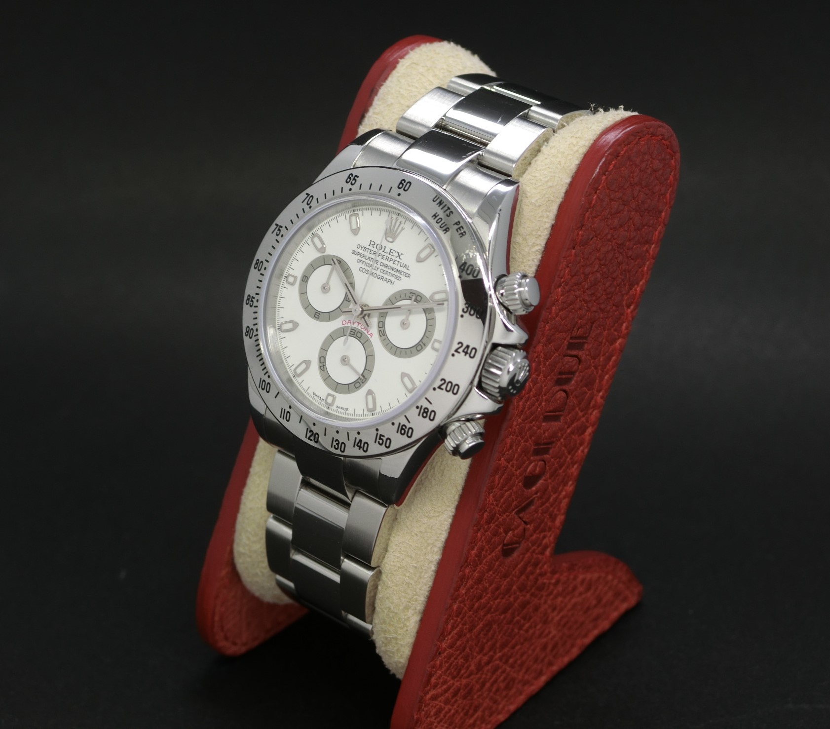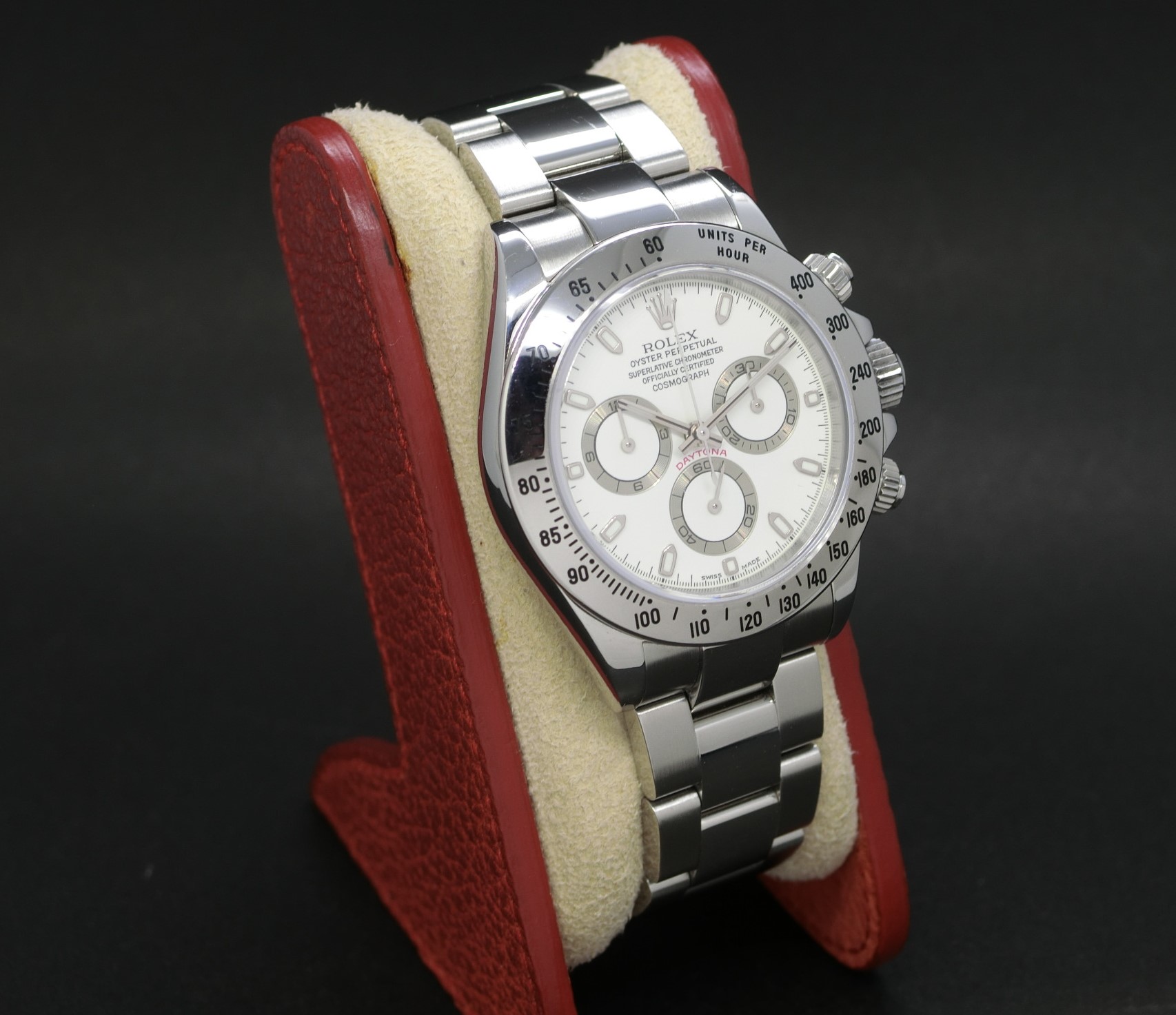 ロレックス 116520は2000年に登場し、2016年頃まで生産されました。 エル・プリメロベースのCal.4030から改良された自社開発ムーブメント、Cal.4130を初めて搭載したモデルとしても知られております。こちらの個体は「マークⅠ」と呼ばれる初期文字盤が特徴です。自然光の下ではアイボリー(クリーム)調に変化する様子をご確認頂け、2004年頃まで採用された初期仕様の細い針も当時のまま装着されております。保証日付:2002年12月使用に伴うキズはございますが、大きな打痕などはございません。ブレスレット:78490 クラスプコード:DT