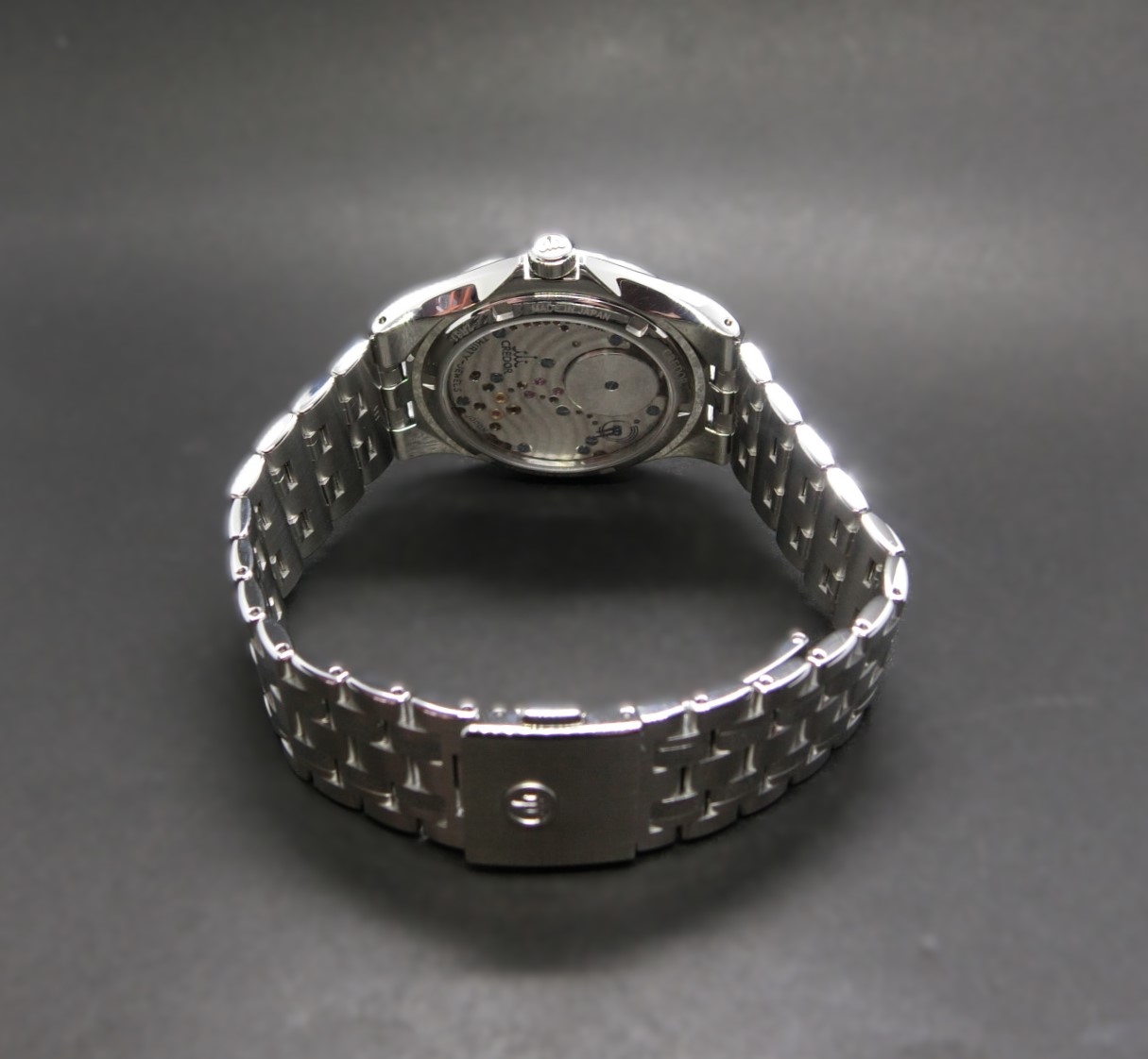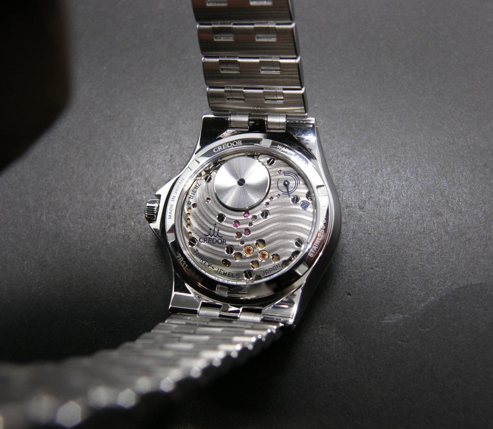 シースルーバックからは、せせらぎを表現した曲面模様のムーブメントが見えます。