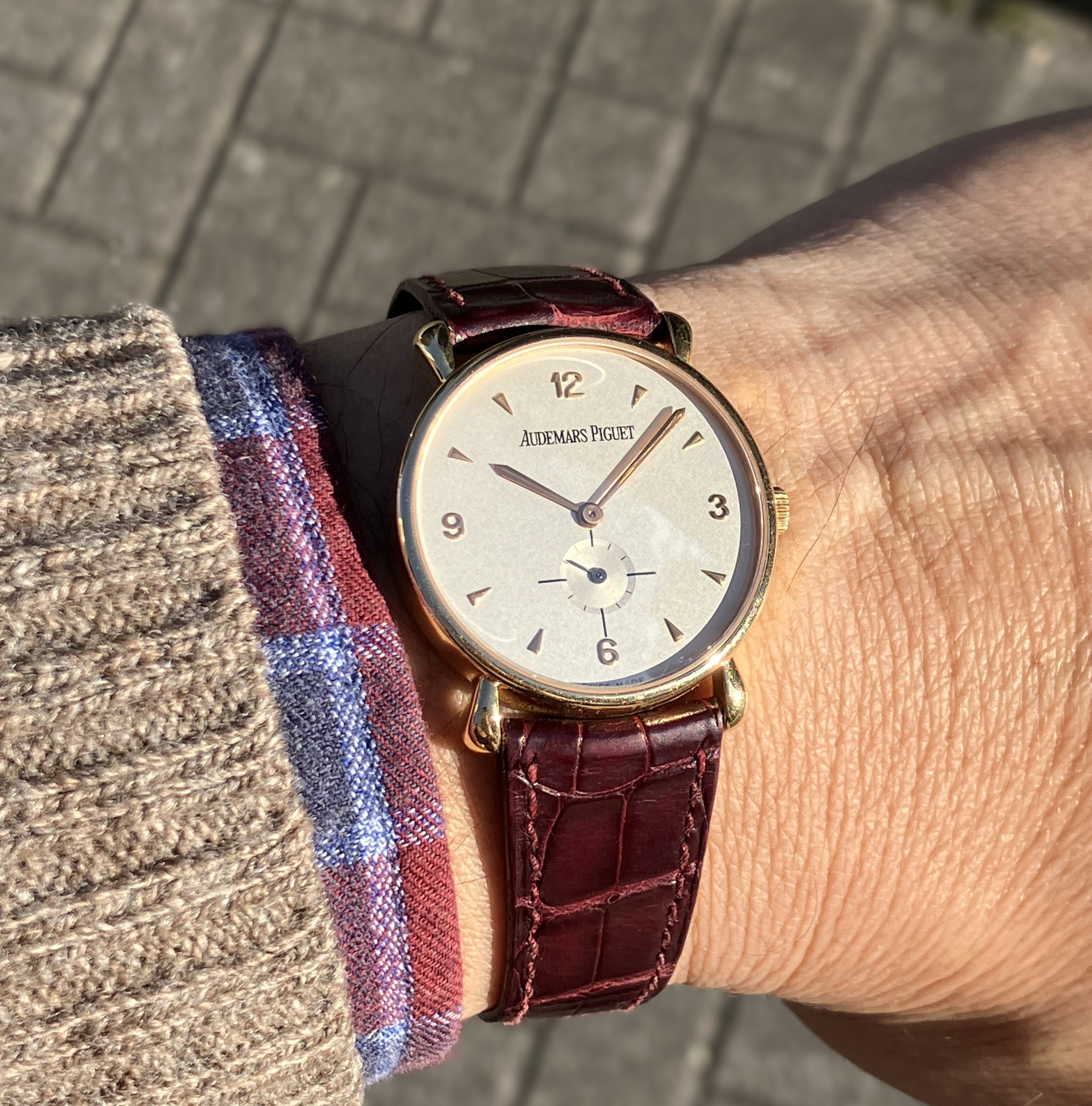 小ぶりで手元に馴染むサイズ感の、上品なドレスウォッチです。