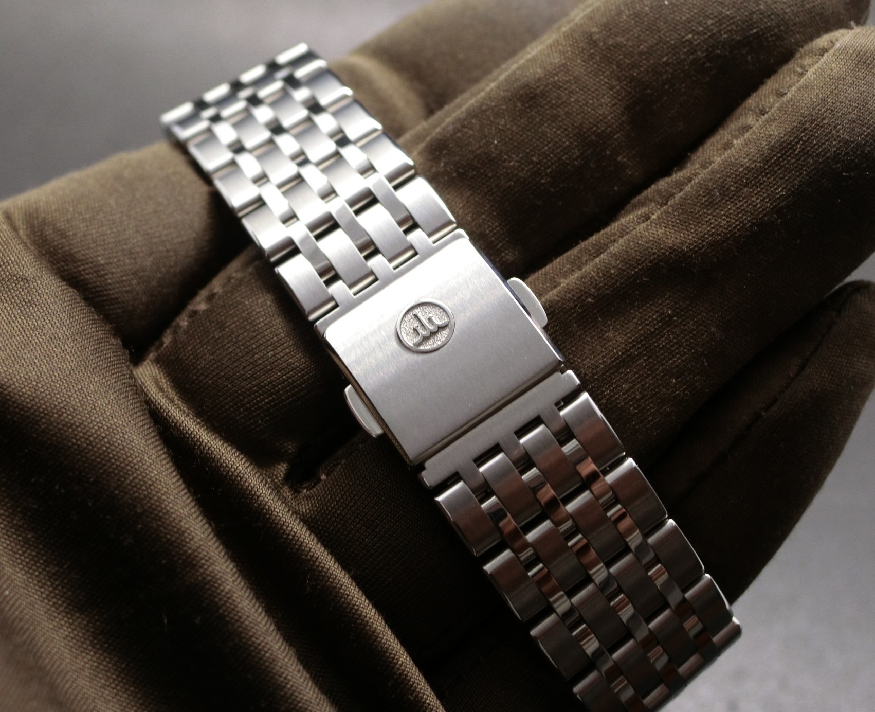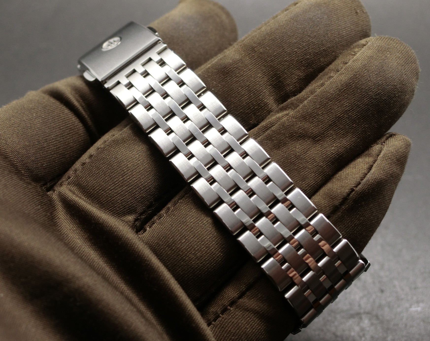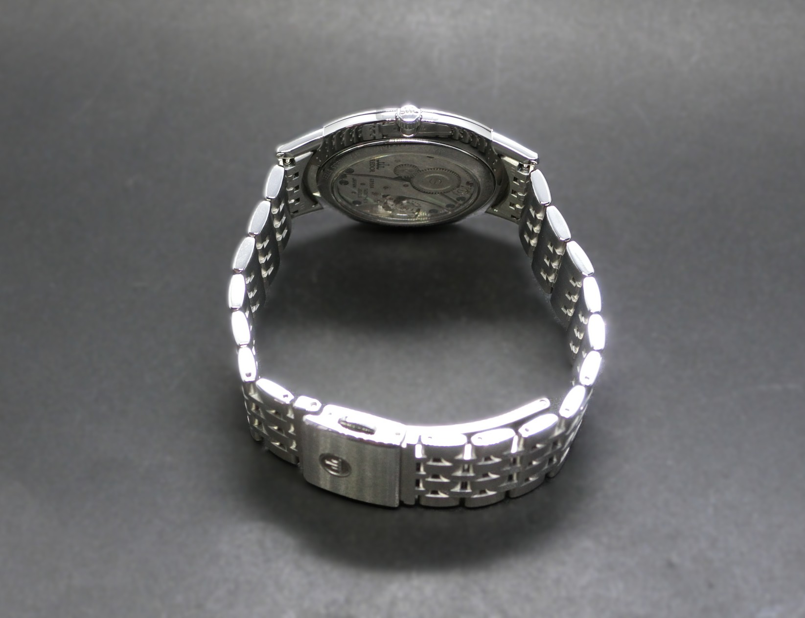 手巻きキャリバー6898を搭載し、放射仕上げのシルバーダイヤルに配された逆カーブのサブダイヤルが奥行きと陰影を演出します。