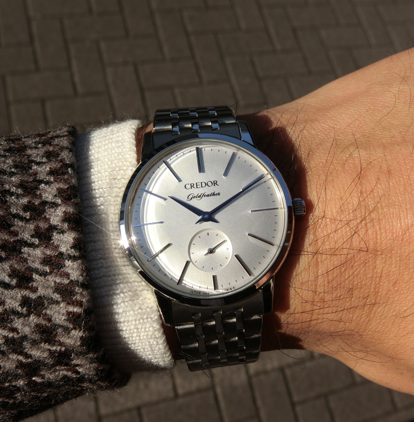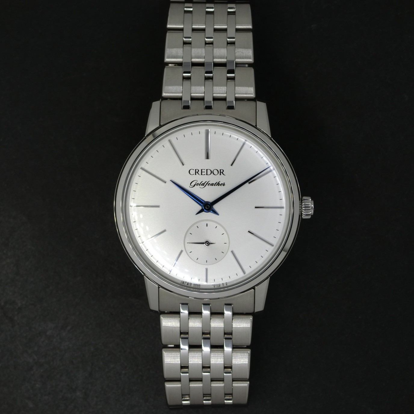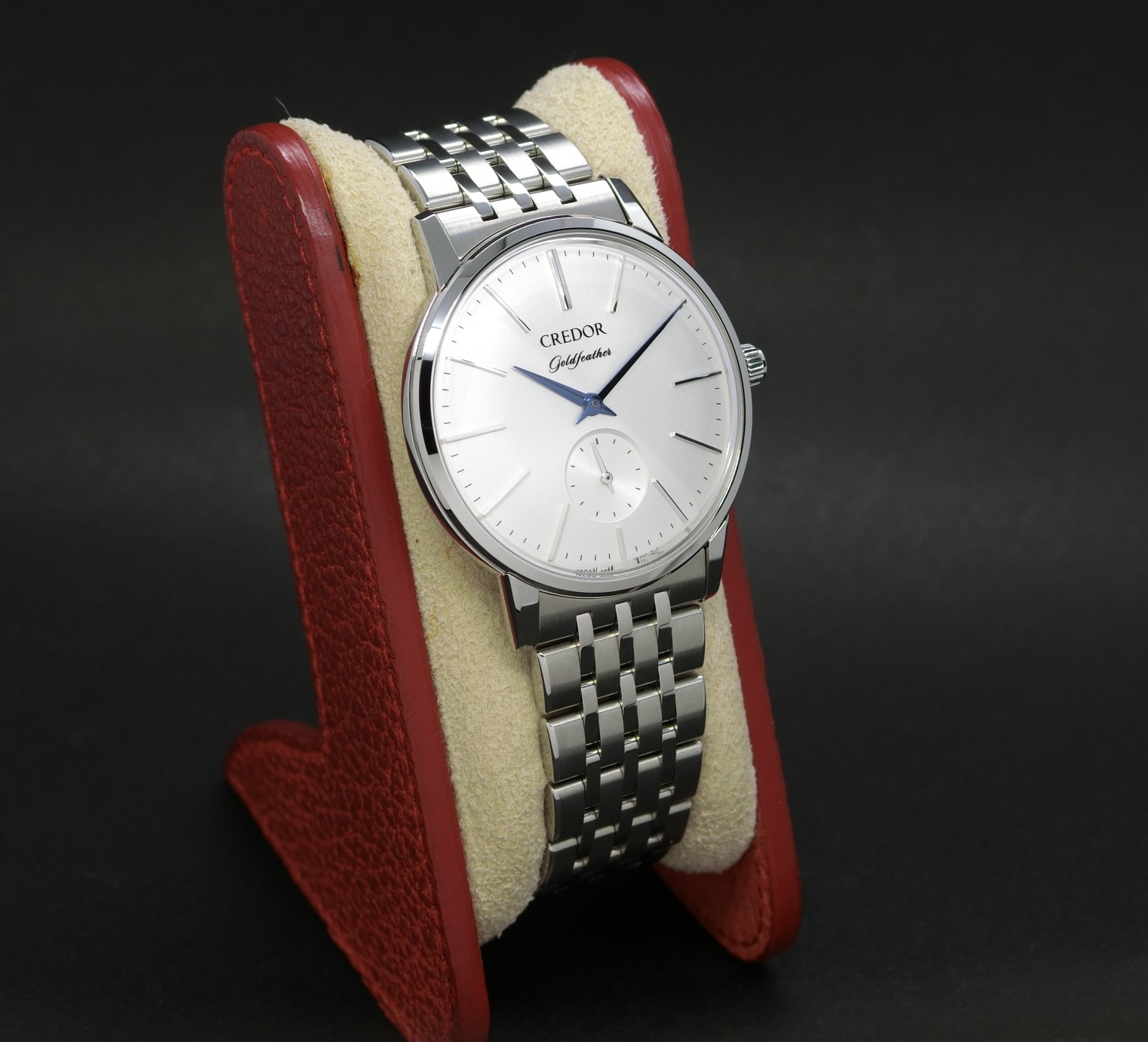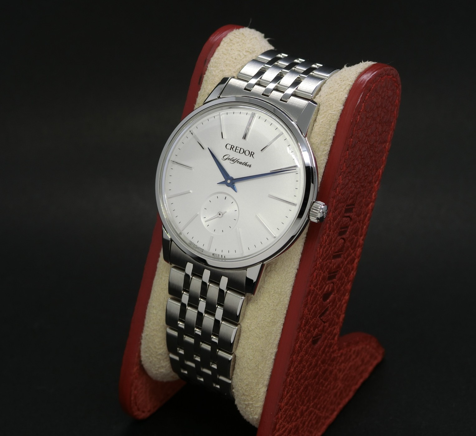 ブルースチール針がアクセントとなり、厚さわずか8mmに収めた、SEIKOの技術が凝縮された一本です。