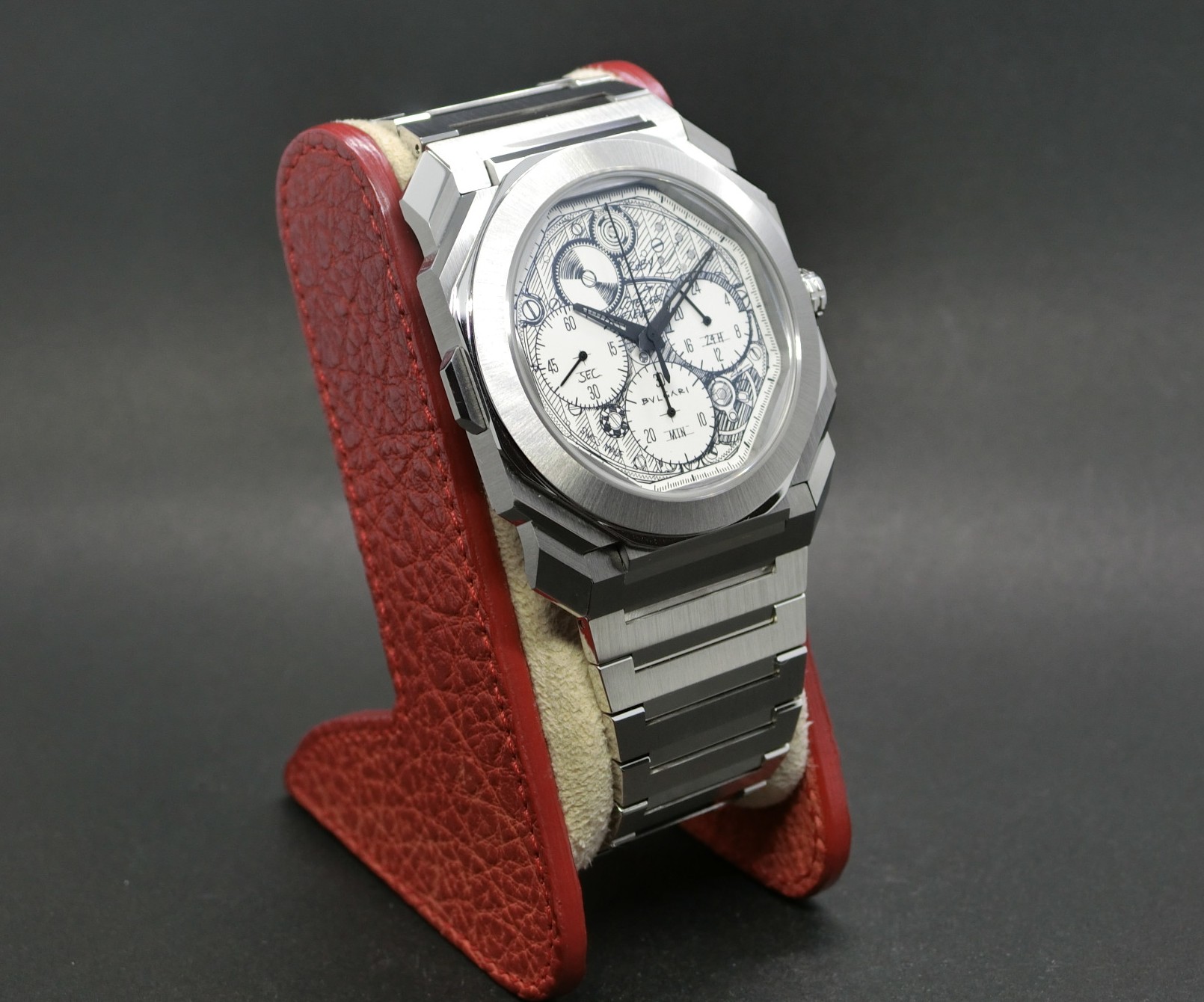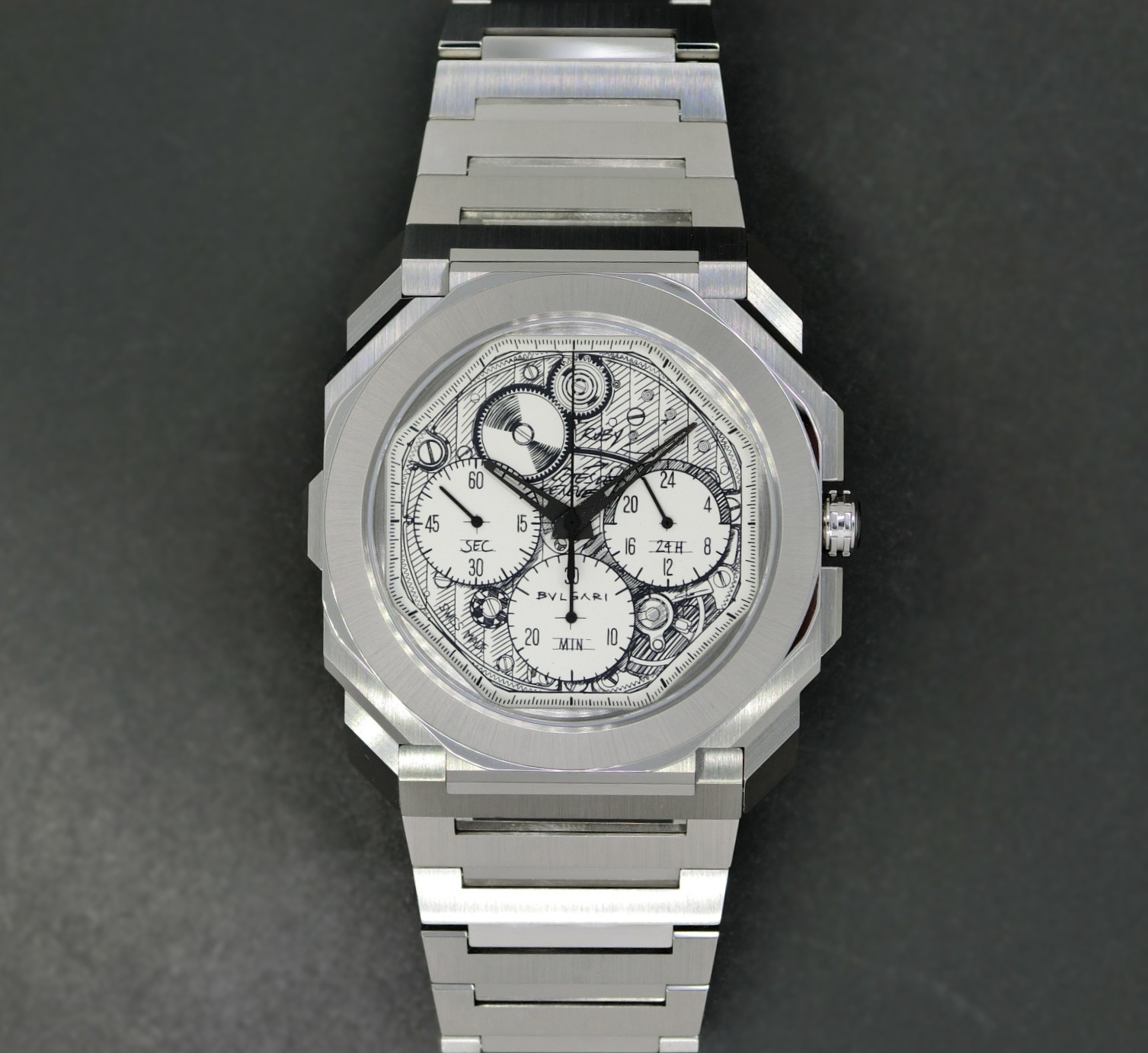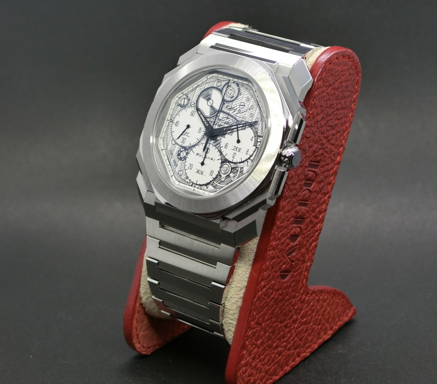 ブルガリのプロダクト・ディレクターによる自社製ムーブメント(BVL318)のフリーハンドスケッチが文字盤に映し出されております。
