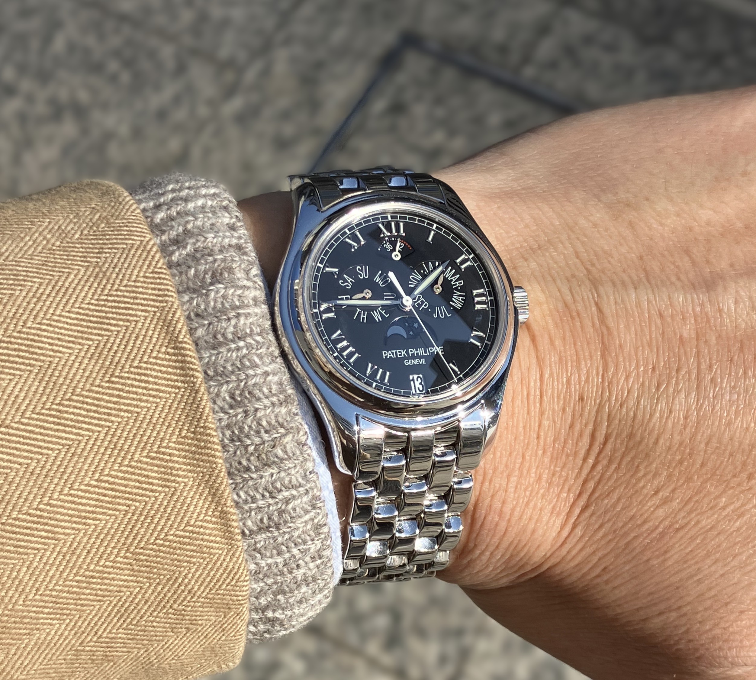 この5036は世界初のアニュアルカレンダー5035にムーンフェイズとパワーリザーブ表記が追加され、1998年の誕生から2005年頃まで販売されたモデルです。