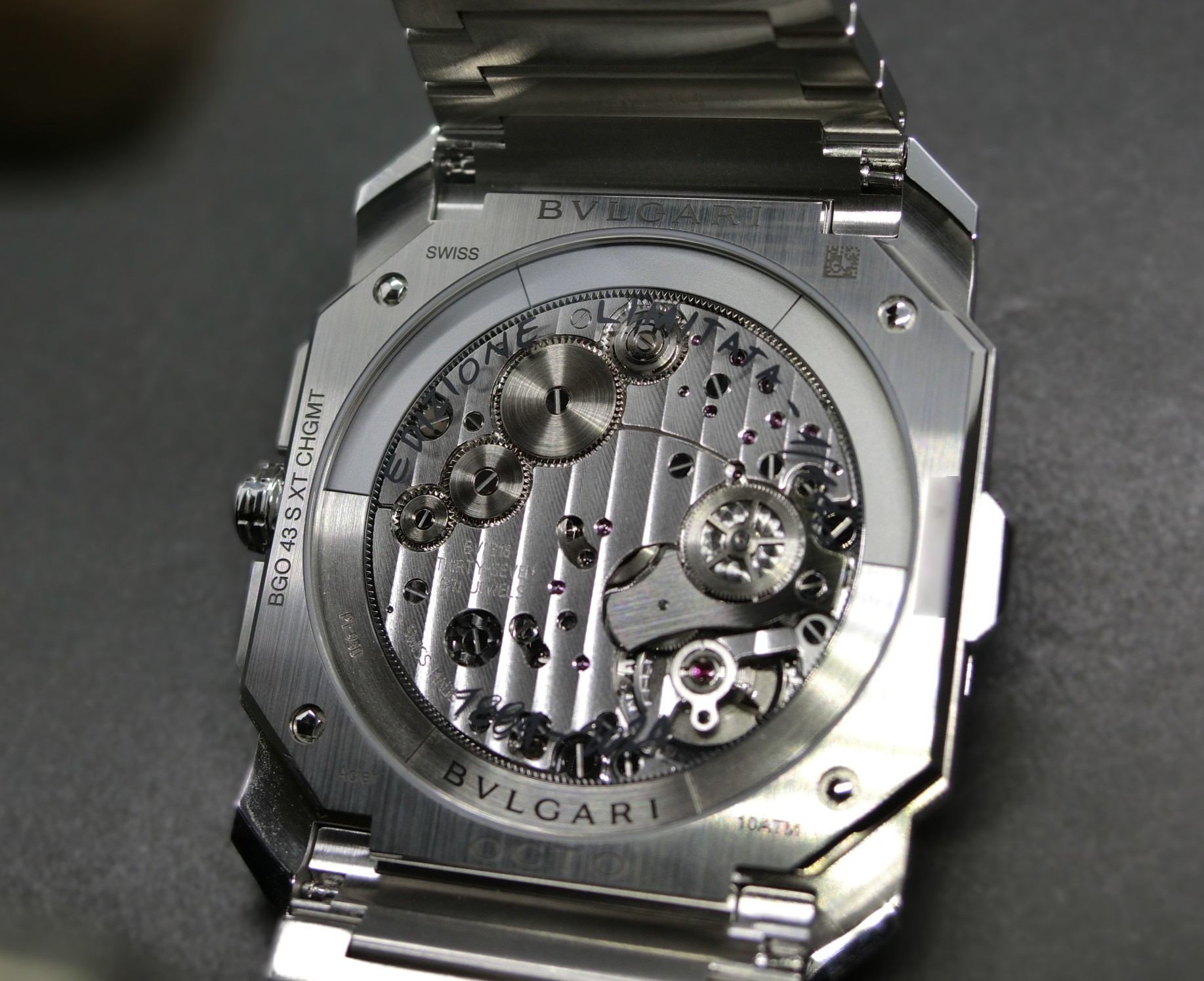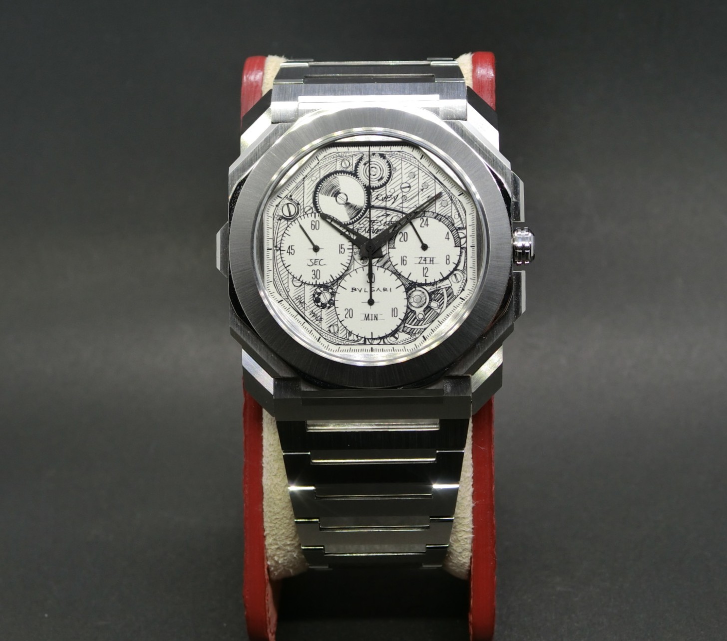 ブルガリのプロダクト・ディレクターによる自社製ムーブメント(BVL318)のフリーハンドスケッチが文字盤に映し出されております。